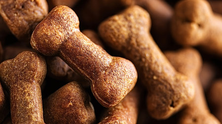 Bone shaped dog treats piled in a full frame macro shot, creating a crunchy brown textured background for pet food, nutrition, and snack concepts in advertising
