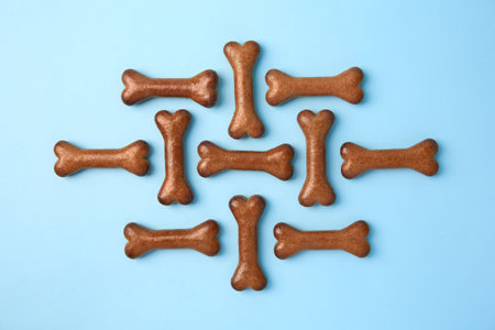 Bone shaped dog cookies on light blue background, flat lay