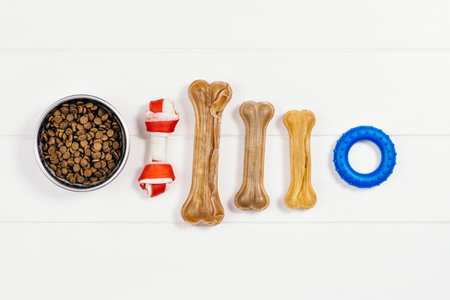 Pet care, veterinary concept. Training and feeding a dog. A white wooden background with a top border of dog toy and edible bones . Space for a text or image