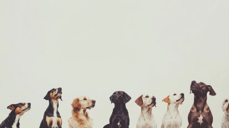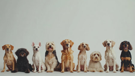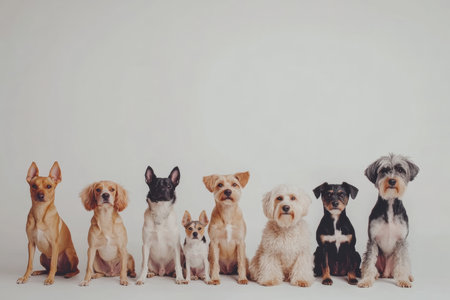 Various dog breeds of different sizes are sitting together, striking a pose against a light background that offers ample copy space.