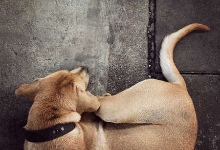 Abandoned lonely stray dog sleeping on the city street, selective focus