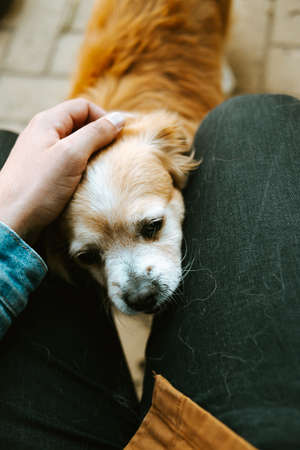 Dog - sad, lying on the gray asphalt road during the day, brown and orange coloring, mongrel pets