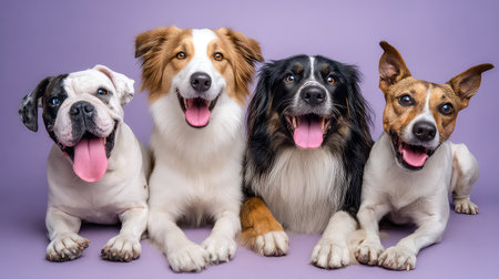 This delightful stock photo showcases four adorable dogs, each radiating joy and happiness, set against a vibrant purple background. With their playful expressions and unique breeds, these pets exhibit the warmth and companionship that dogs offer. Perfect for any pet-related project!