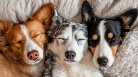 A heartwarming scene featuring three adorable dogs peacefully resting together on a soft blanket, embodying comfort and companionship in a cozy indoor setting.