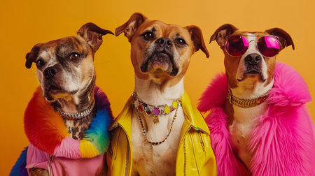 Group of dogs in colorful clothes on yellow background. Studio shot.