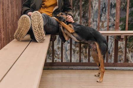 Cute black and brown dog lying on its owner sitting on the wooden bench on the outdoors background