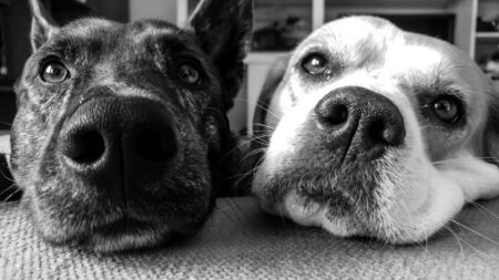 Two dogs sit side by side a mixed breed and a golden retriever both looking intently at the camera with neutral expressions.