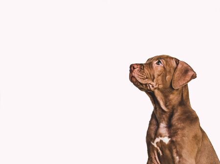 Young, charming puppy of chocolate color. Close-up, side view. White isolated background. Studio photo. Concept of care, education, obedience training and raising of pets