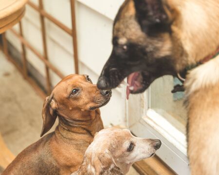 Three dogs are sitting together, looking up with keen interest. Generative AI