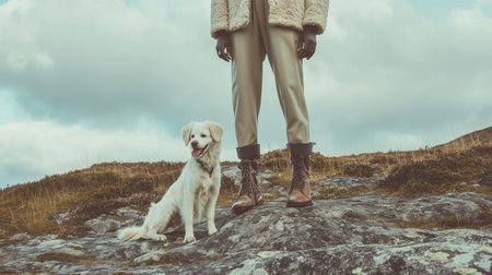 A person and their dog standing on a rocky landscape in a beautiful natural setting during overcast weather
