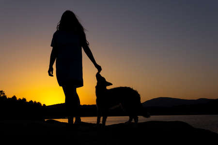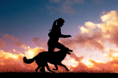 Silhouette of young woman with her dog in the sunset outdoor.