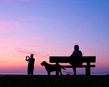 man takes pictures with moblie phone of colorful sunset while woman sits with dog on bench