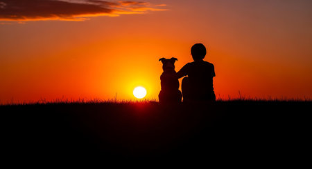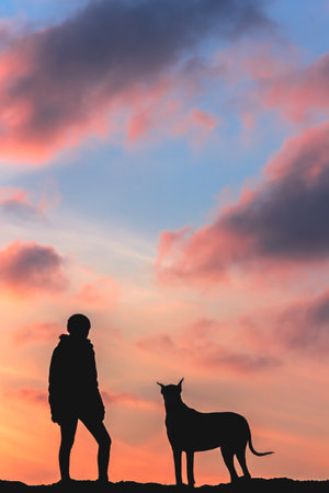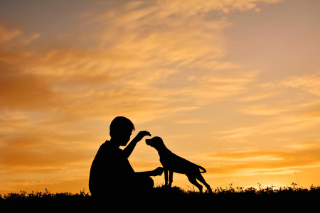Silhouette of a boy and dog on the sunset background.