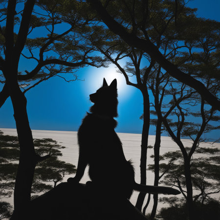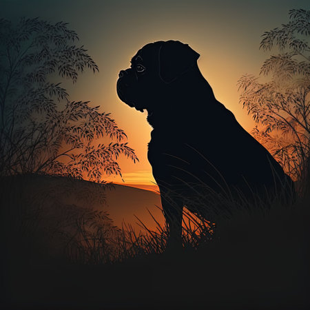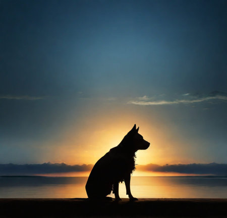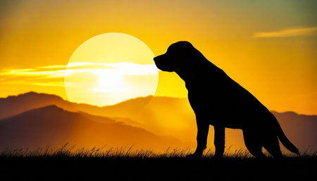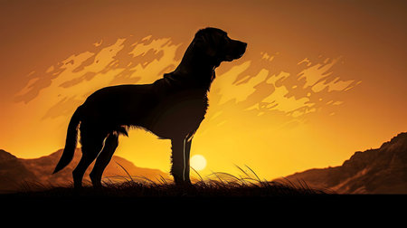A dog silhouette at sunset, peaceful scene