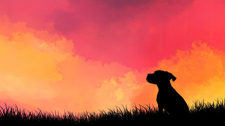 A serene silhouette of a dog sitting in grass during a vibrant sunset. The colorful sky creates a peaceful atmosphere, perfect for nature lovers.
