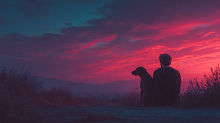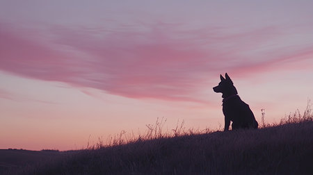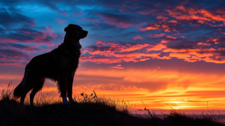 A beautiful silhouette of a dog sitting calmly on a hill during a stunning sunset, showcasing vibrant colors in the sky and a tranquil landscape atmosphere.