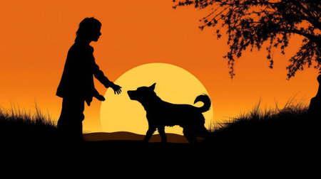 Silhouette person is playing with dog. Generative AI
