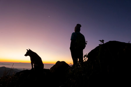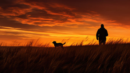 Silhouette of a man hiking with his dog against Orange Sunset Sky in Nature Landscape