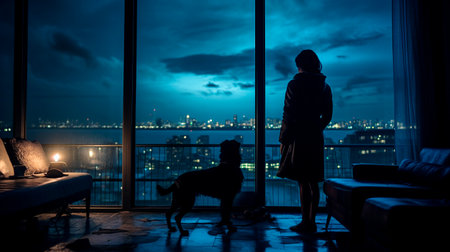 Silhouette of a woman with a dog on the background of the city at night