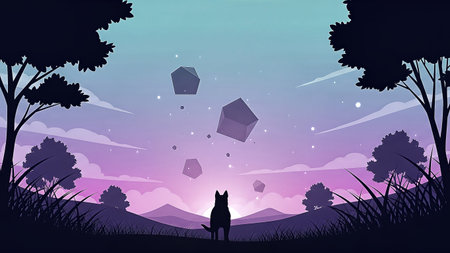 A dog silhouette watches floating geometric shapes and glowing particles against a vibrant purple and teal gradient sky. Minimalist digital art evoking wonder.