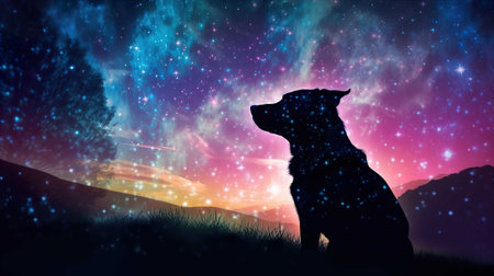Double exposure of night sky stars , dog silhouette Generate AI