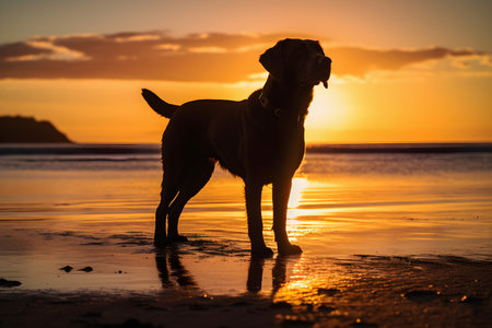 Labrador retriever dog silhouette at sunset on the beach. Shallow depth of field. Generative AI illustration.