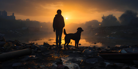 A person and their loyal dog navigate a world of waste. Concept Environmental Awareness, Pet Friendship, Recycling, Pollution Effects, Sustainable Living