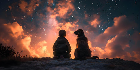 A boy sits with his dog on a hill gazing at a starfilled sky. Concept Nature, Friendship, Starry Night, Curiosity, Companionship