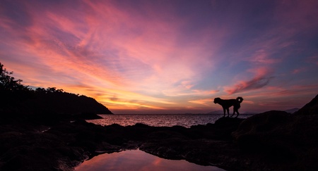 Panoramic view on sunset ns dog with his master, Castiglioncello, Livorno municipality, Tuscany