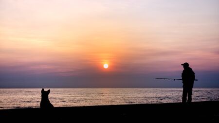 Silhouette of the fishing and dog by the sea in the morning