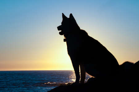 husky dog silhouette sit at sunset on coast of Gulf of St Lawrence in Gaspe Peninsula,Quebec,Canada