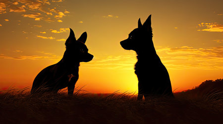 Silhouette of a pomeranian dog and another border collie at sunset. Animal love. Best friends. Selective focus. Copy space.