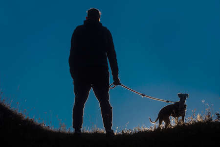 Silhouette of man playing with his dog at sunset. Backlight. Copy space.