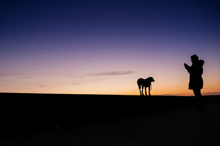 Sunset silhouettes woman and dog on the walk