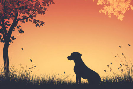 Silhouette of a dog sitting in a field of grass with falling leaves and trees at sunset, creating a serene autumn scene