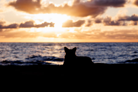 Silhouette of a welsh corgi pembroke lying on the sandy beach, beautiful sunset sky and blue ocean