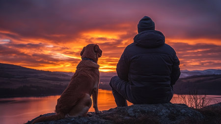 Hunter and his loyal retriever dog enjoying a stunning sunrise by the tranquil lake, creating a serene moment in nature's beauty