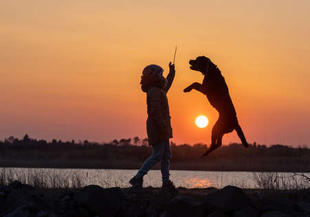 Silhouette of woman playing with a dog at sunset in front of a lake. Love for animals. Selective focus. Copy space.