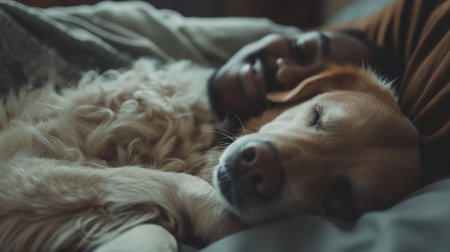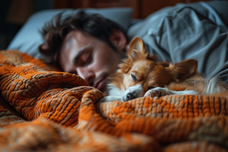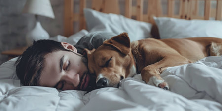 Man sleeping in bed with dog, enjoying peaceful moment of rest