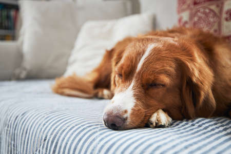 Cute dog sleeping on sofa. Tired Nova Scotia Duck Tolling Retriever at home.