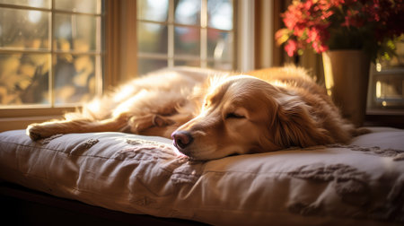 A golden retriever dog sleeping soundly and peacefully in its soft bed on the floor, receiving warm sunlight. Domestic pet rest.