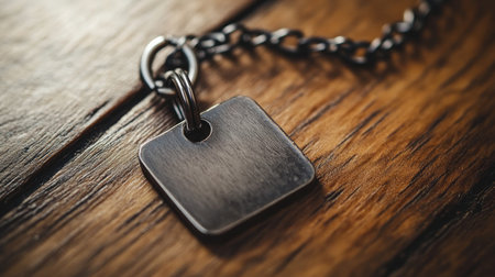 Close-up of a weathered dog tag on rustic wood, symbolizing military service and sacrifice. With Generative AI technology.