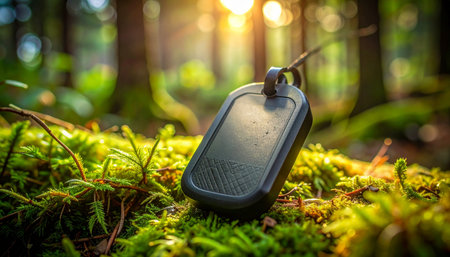 A personal GPS tracker rests on a vibrant bed of green moss in a tranquil forest. The warm, golden light of a rising sun filters through the trees, suggesting a new day of adventure, the importance of staying connected, or the story of an item lost and waiting to be found.
