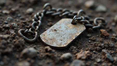 Military dog tags on dirt and gravel weathered and reflective in dim light