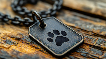 A detailed view of a black metal pet tag showcasing a paw print design, set against a textured wooden surface. The tag reflects a warm, inviting ambiance.