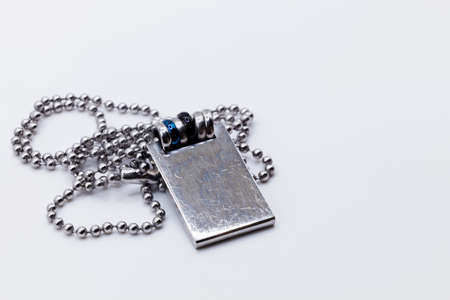 Dog tags on a chain on a white background close-up.
