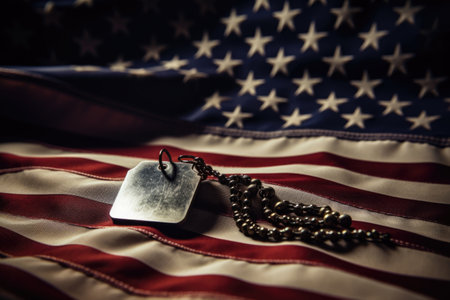 Dog Tags on American Flag, Military dog tags on the backdrop of the American flag, symbolizing the dedication and sacrifice of veterans for Veterans Day.