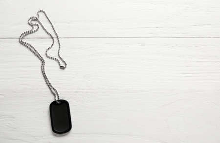 Military dog tag on white wooden background