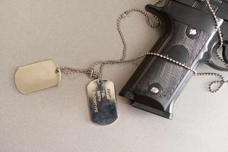 Blank military dog tags and a gun on abandoned rusty metal plate. Memories and sacrifices concept.