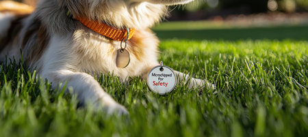 Pet Safety Concept: Microchipped Collar Tag on Relaxing Dog in Grassy Lawn